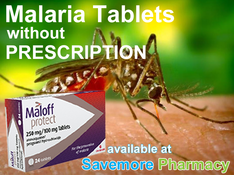 Antimalarial Tablets available without prescription to adults over 18, weighting more than 40kg and travelling to areas affected by malaria. Maloff Protect tablets contain two antimalarial agents, atovaquone and proguanil.